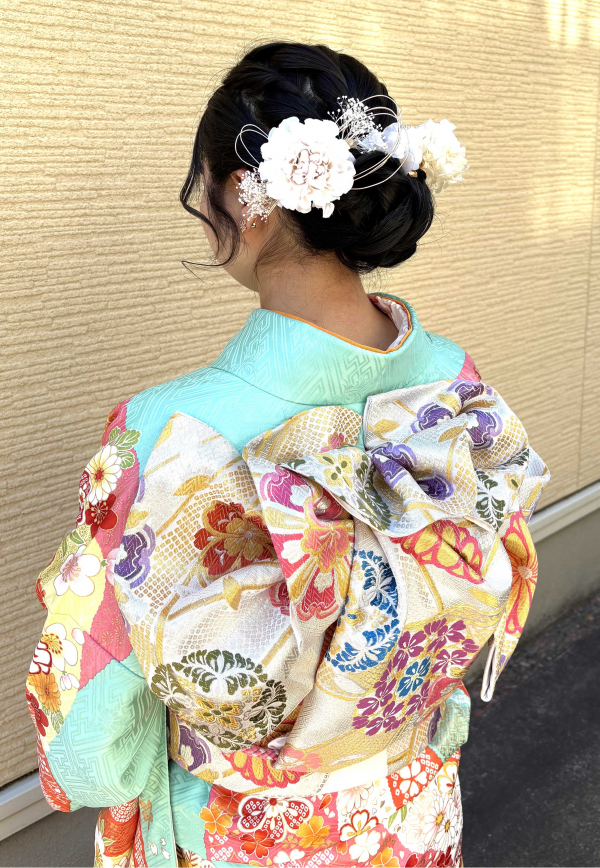 ヘアーセットと帯結び前撮りの時と雰囲気を変えて可愛く仕上げました。